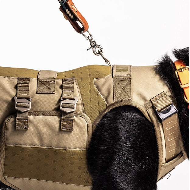 Adjust the left and right shoulder straps to a length that provides a snug fit around the dog's neck. For best performance, keep the strap length even on both sides. Slide the vest over the dog's head. To secure the underside, start by pulling up the right and left foreleg hooks one at a time, inserting them into the webbing loop that provides a snug fit around the dog’s chest. Finish securing the vest by pulling up the right and left hindleg hooks one at a time, inserting them into the webbing loop that provides a snug fit around the dog’s midsection.